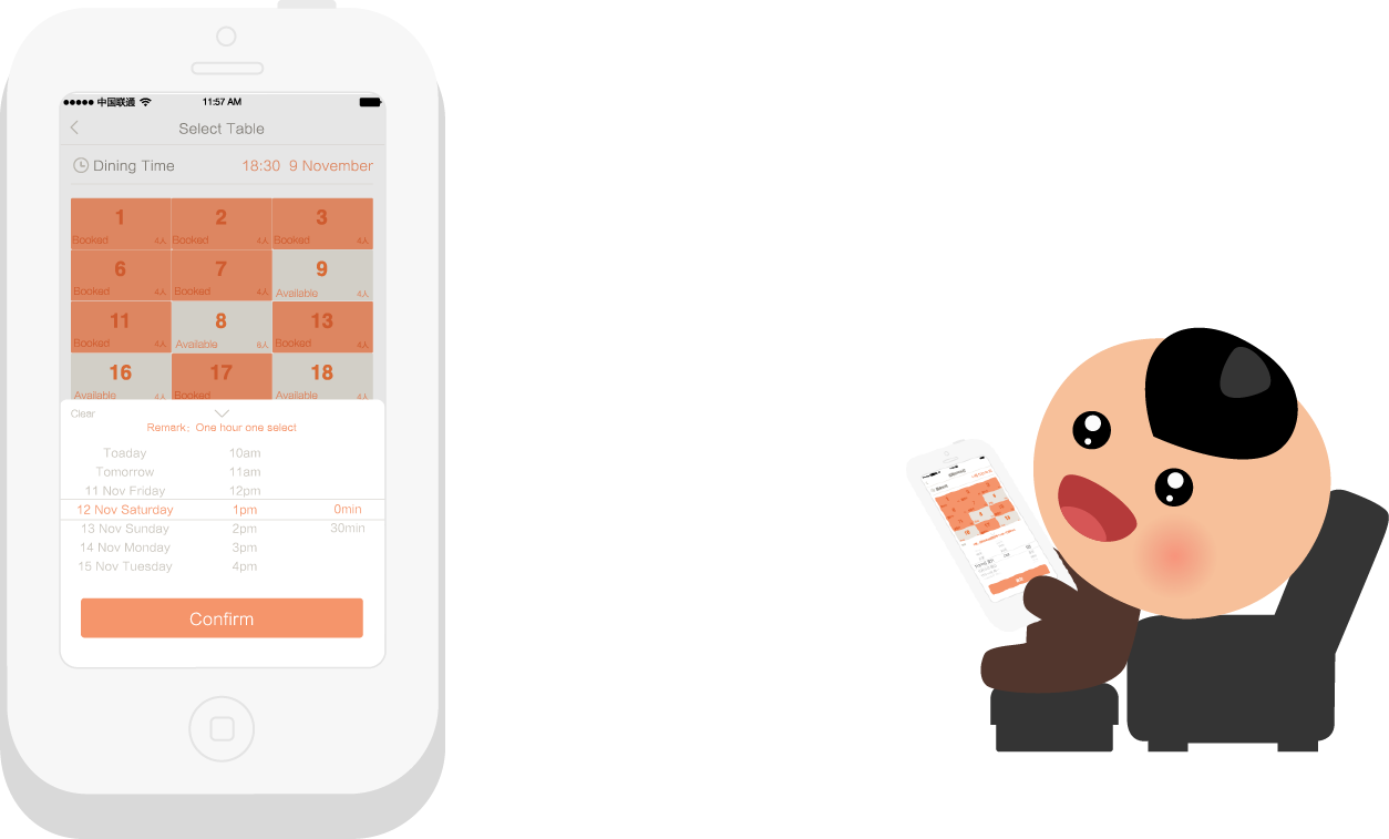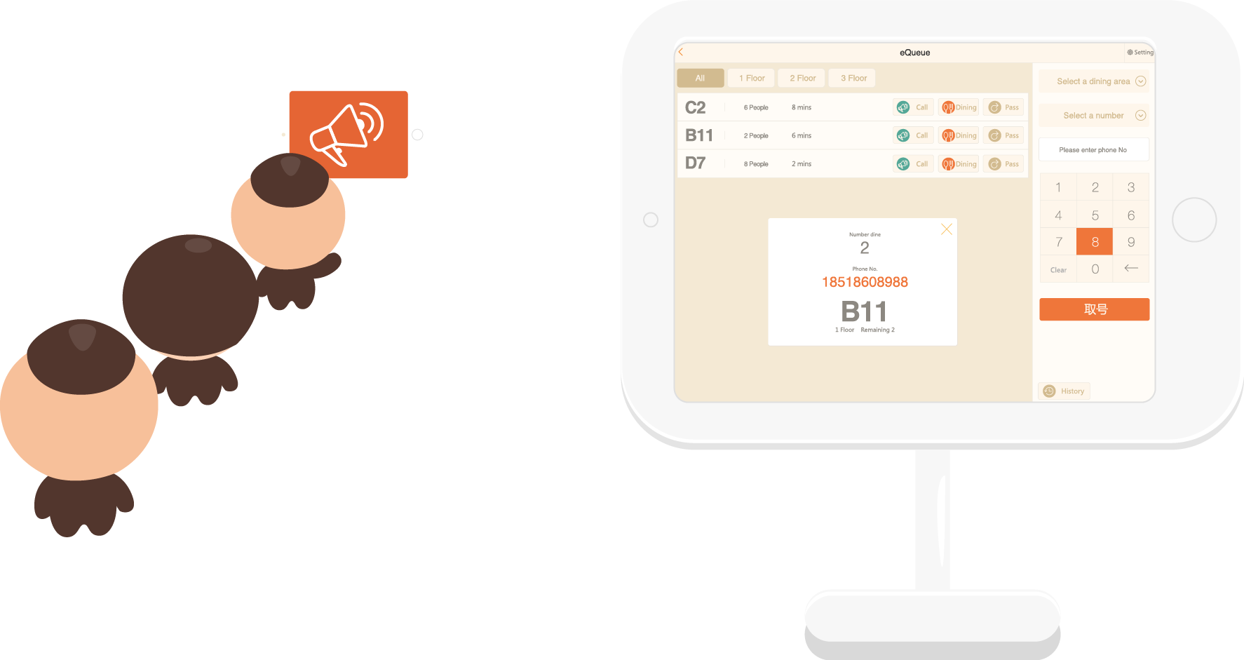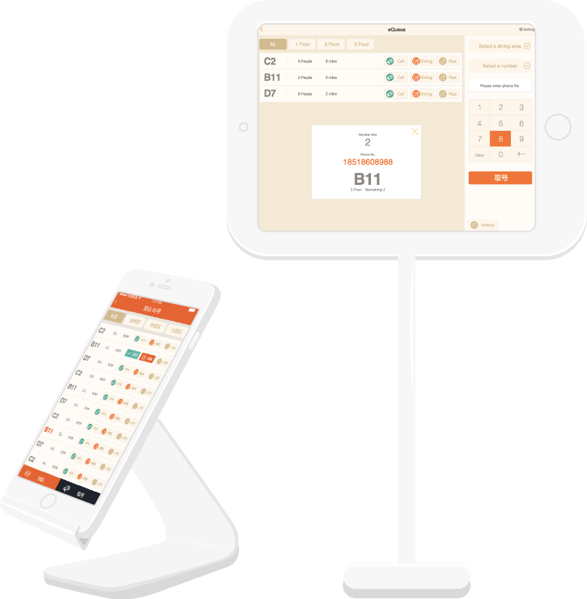 The waiter giving the number and the customers getting a number by themselves. Waiting time, customer number, phone number and queuing number are all available.