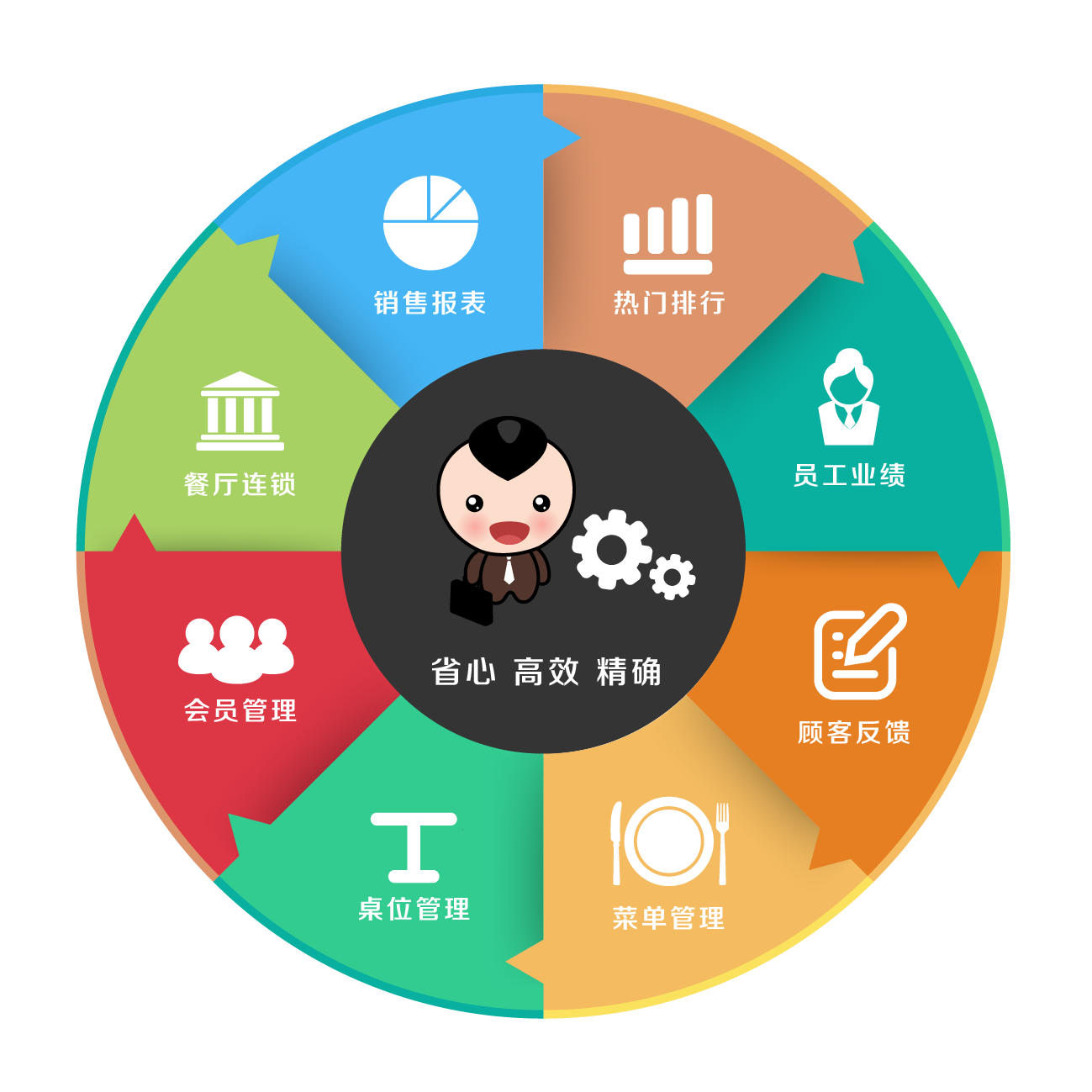 后台功能强大,权限控制严谨。销售报表、热门排行、员工业绩、顾客反馈、菜单管理、桌位管理、会员管理以及餐厅连锁等尽在掌握;全面规范餐厅运营,有效规避管理漏洞。高度定制,无缝对接餐厅现有系统,统一管理后台,减少用户操作流程与经营成本。