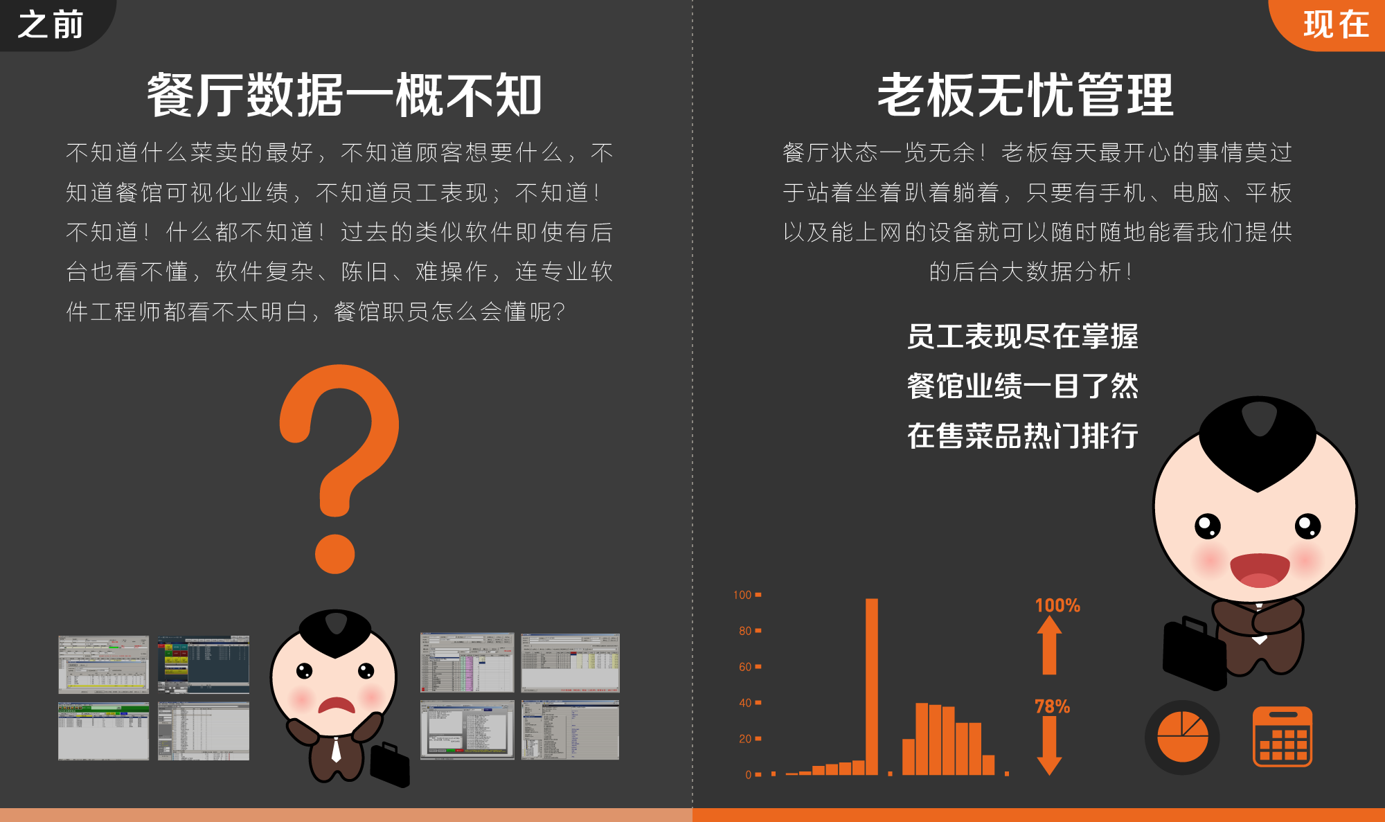 老板可以轻松管理餐厅菜品、台位、员工、支付方式、销售报表、业绩排行、走势图以及大数据分析等。支持:PC、平板、手机