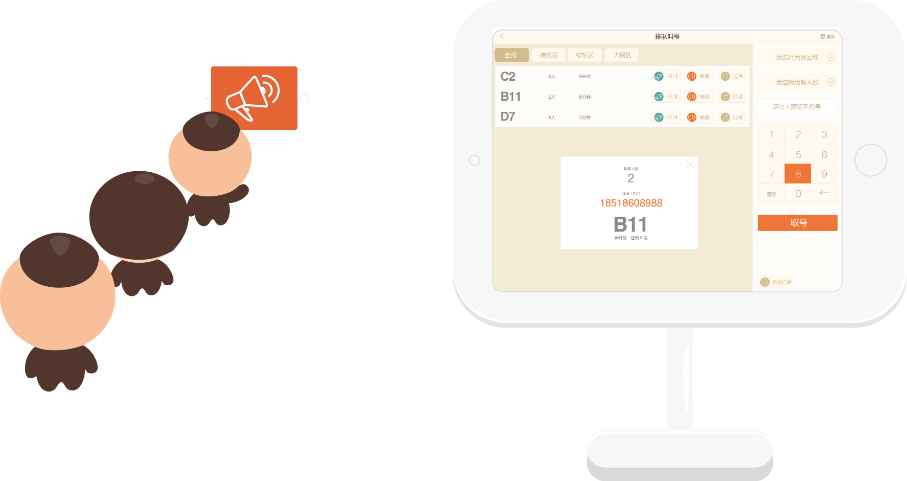 服务员发号,顾客自取小票;等位时间、人数、手机号以及排队号码一应俱全。