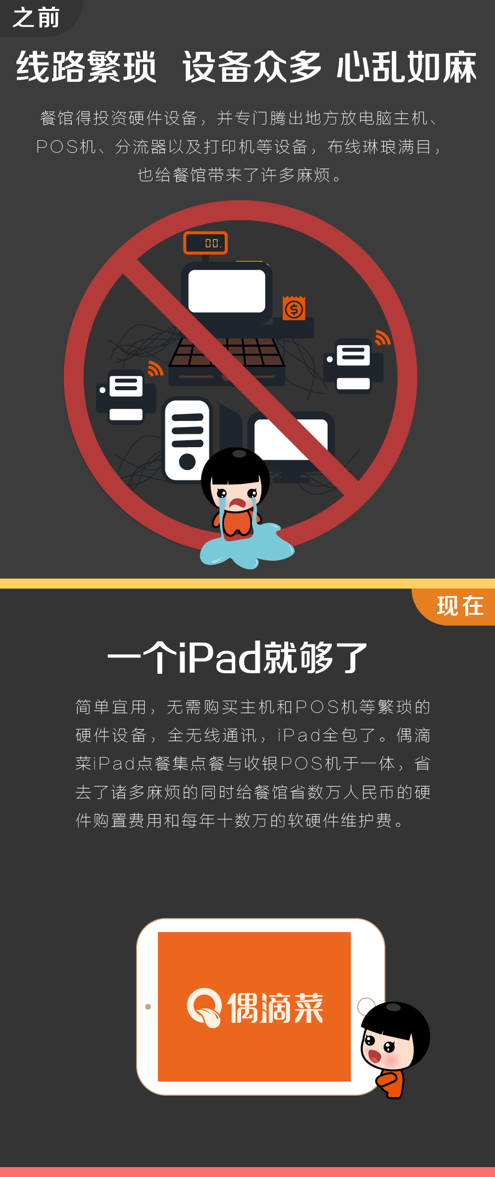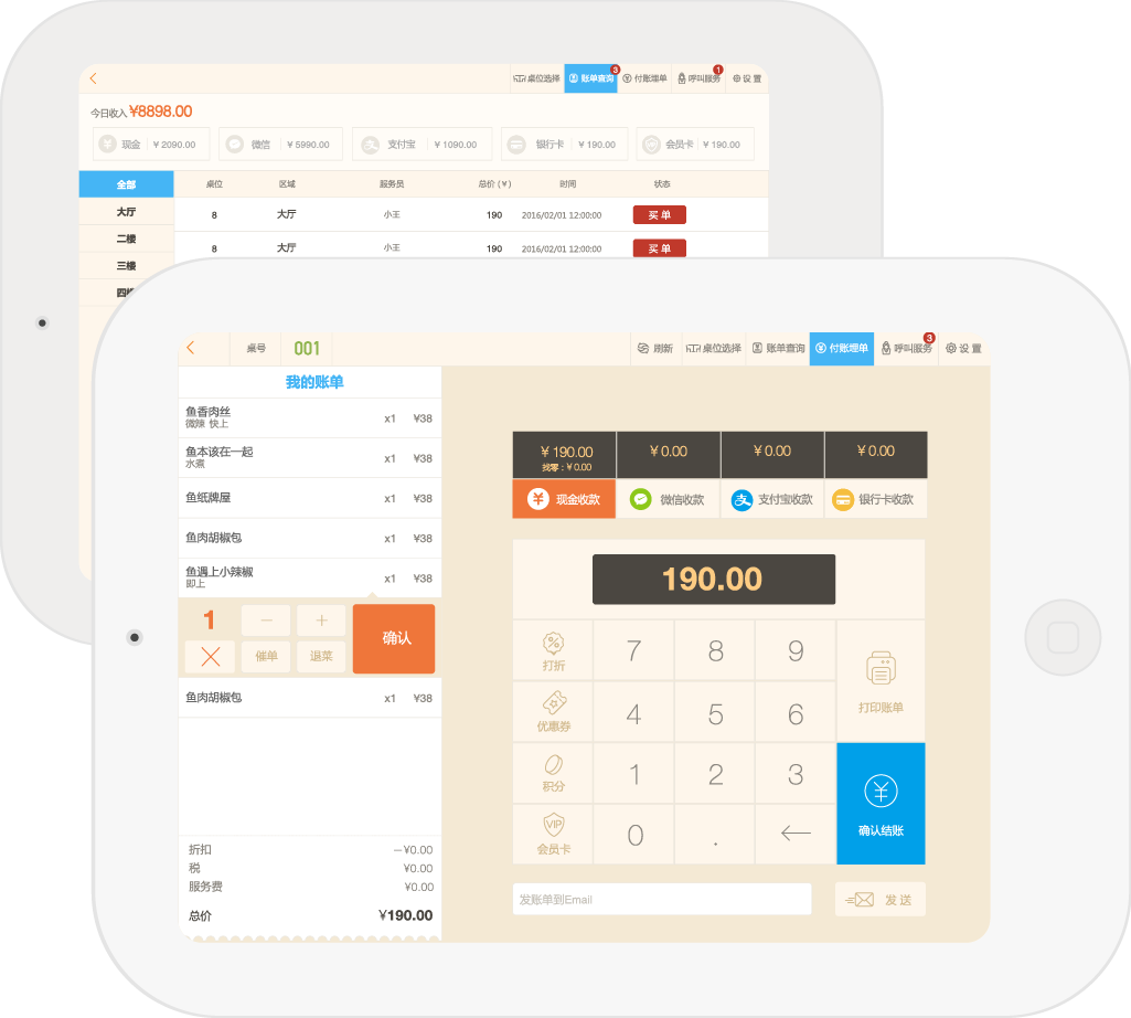 不用担心忙碌、失误导致的账目混乱!前台iPad自动对应所有桌位账单状态!服务端也支持微信、支付宝支付,顾客可在线支付,多个支付端口让收银畅通无阻!